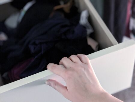 Hand pulling open a white dresser drawer to look at undergarments inside