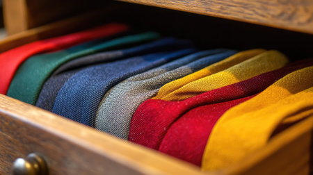 This image captures an organized array of colorful ties in a wooden drawer, highlighting various fabric patterns and textures, perfect for fashion lovers.