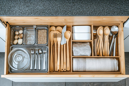 Top view closeup housewife hands tidying up cutlery in drawer general cleaning at kitchen