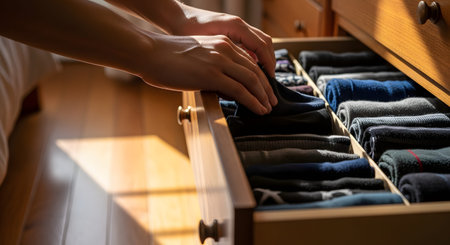 Close-up of hands carefully arranging folded socks and garments into a wooden drawer organizer. Sunlight illuminates the orderly compartments, highlighting a theme of home organization, decluttering, and tidy storage solutions.