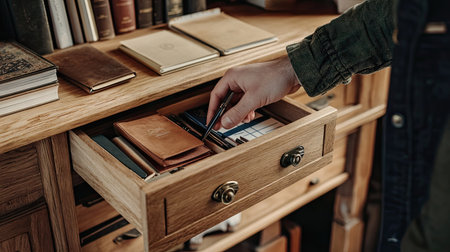 A hand gently pulling open the drawer of a wooden table, with stationery, a pen holder, and a few books neatly arranged inside.