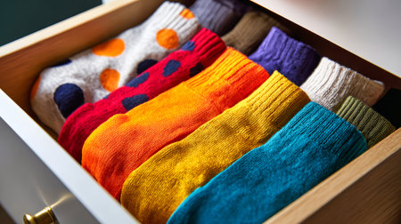 A collection of vibrant socks is perfectly arranged in a drawer, showing various colors and patterns in a cozy, light-filled bedroom setting.