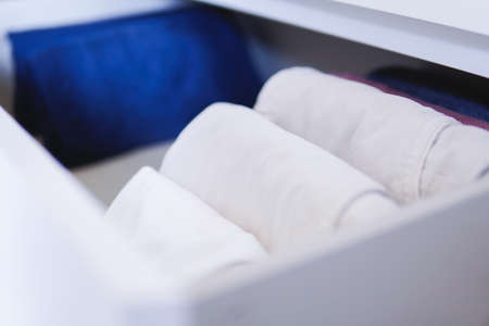A lot of different folded clothes perfectly arranged in a closet - Marie Kondo Konmari method concept