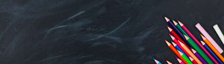 Back to School concept. Colorful pencils on blackboard background. Close up, flat lay, copy space, top view, long banner, long banner