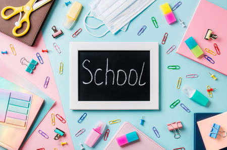 Blackboard with letters school made with chalk. School supplies, pencils, scissors and colored books on blue and pink background. Top view or flat lay. Back to school concept