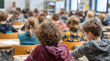 Students sit attentively in a classroom, engaged in their schoolwork as a teacher stands in front, explaining lessons. The atmosphere is calm and focused, promoting learning.