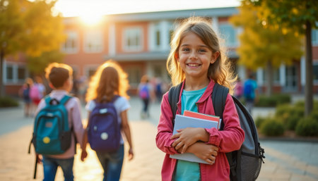 Smiling girl holding books at school during golden hour.