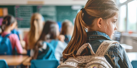 A girl with a backpack sits in a classroom with other students. She is looking out the window, possibly daydreaming or waiting for the bell to ring. Concept of routine and boredom