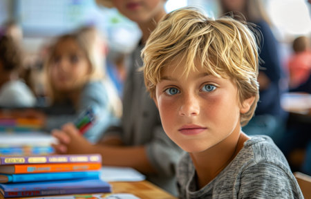 A cute little schoolgirl is looking at the teacher. She is in a school classroom with another student. The concept of back to school. The importance of education.