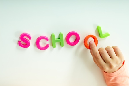 Close-up of girl hand making word �school� from colorful letters