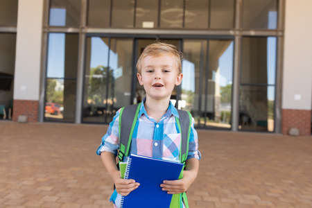 Portrait of smiling cute caucasian elementary schoolboy with books standing in school campus. unaltered, childhood, education and back to school concept.