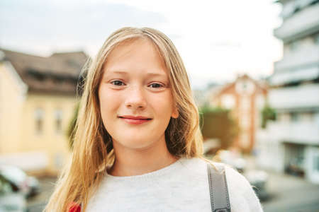 Outdoor close up portrait of adorable 10-12 year old girl wearing backpack