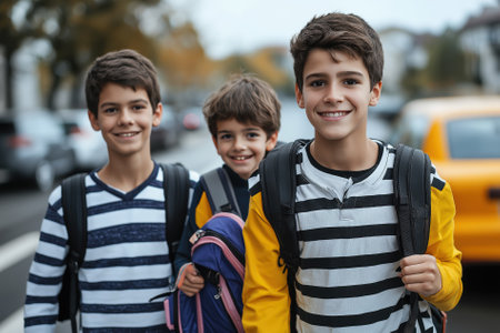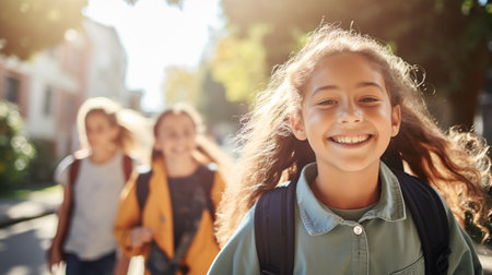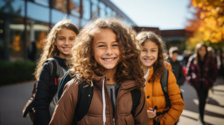 Group of smiling schoolchildren wearing backpacks, standing outdoors near a school building, dressed in colorful jackets, showing happiness, diversity, and friendship