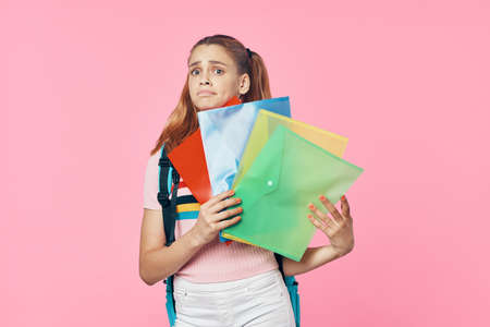 beautiful schoolgirl with folders in hand and backpack on her back pink background
