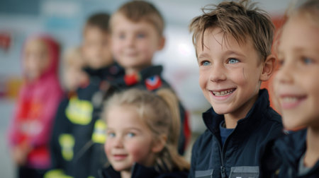 A diverse group of children, ranging in ages and ethnicities, standing next to each other in a row. They are all looking towards the camera with smiles on their faces, creating a heartwarming and inclusive scene.