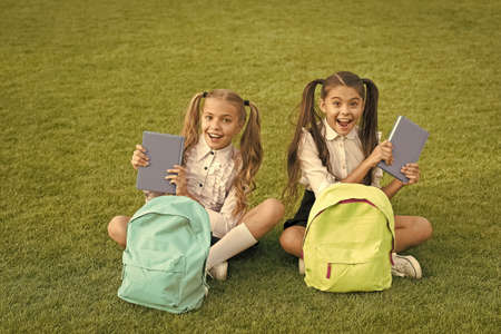 Books are best friends. Happy kids hold books outdoors. Adorable bookworms on green grass. School library. Literature and language. English grammar. Education and knowledge. Books about friendship