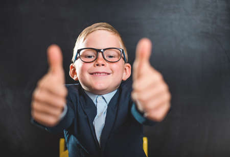 Portrait of smart school child with thumb up near blackboard blank and looking at camera. Happy kid boy in uniform. Go back to school. First day of fall. Boy in glasses