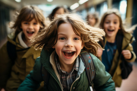 Cheerful schoolchildren wear jackets in school corridor.