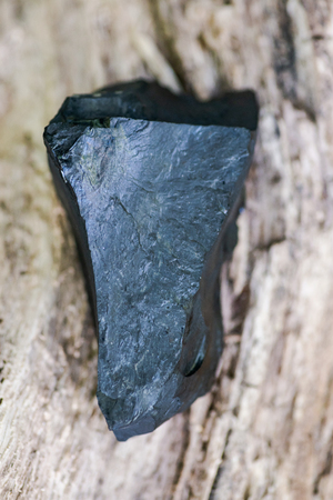 Natural Jet chunk from Russia on a tree bark in the forest preserve. Mineraloids mineral class.