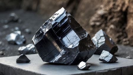 Chunks of coal sit on a smooth, dark surface, highlighting their glossy black texture and sharp edges under soft lighting. The overall appearance emphasizes the raw beauty of natural minerals.