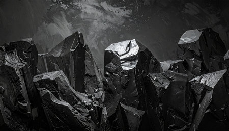 A striking abstract composition featuring sharp, angular black crystals with textured surfaces. The monochrome palette enhances the dramatic interplay of light and shadow.