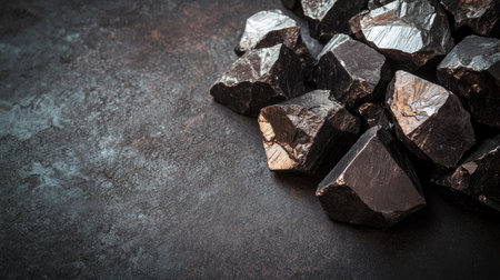 Manganese ore pieces with a metallic shine, placed on a dark background, with light reflecting off their surfaces. No people, copy space