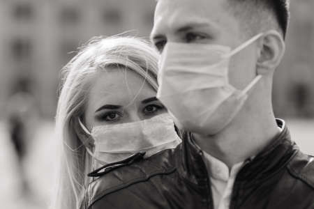 Young couple in masks on city street. Isolation, quarantine.