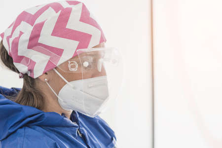 Female dentist prepearing for work under virus protocols.