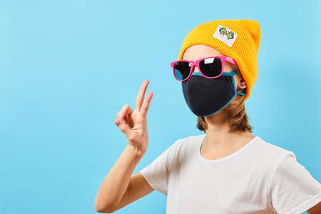 Man with black hat, medical mask, yellow sunglasses on grey background