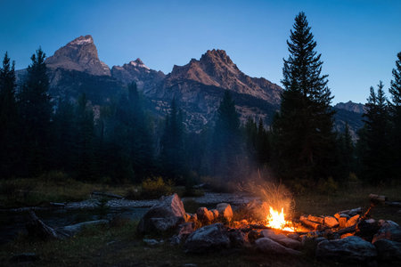 A campfire burns bright under the night sky with mountain peaks in the background as people gather around.