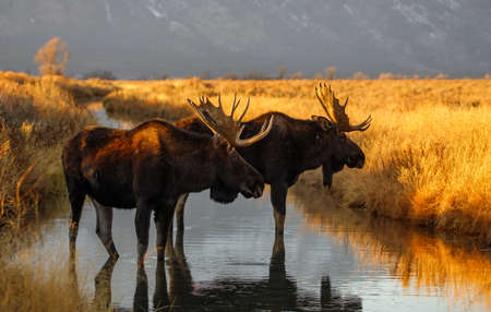 Huge bull moose drinking in stream
