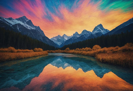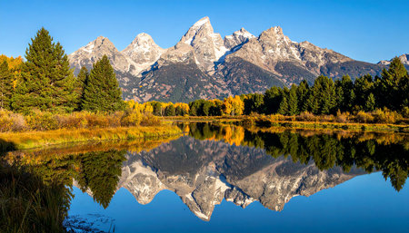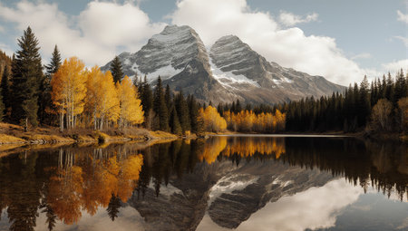 Majestic mountain range reflected in tranquil lake with vibrant autumn foliage landscape