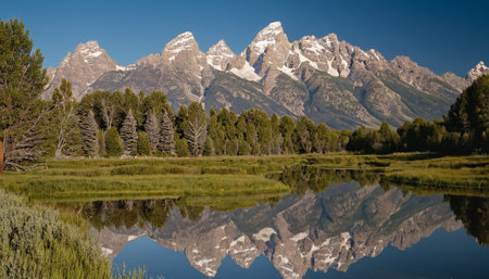 Serene landscape featuring the Grand Tetons and their reflection in a lake. Copy space at the top for text
