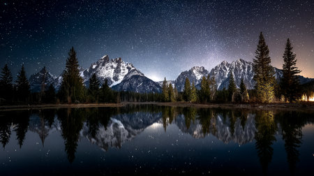 A serene and tranquil lake beautifully reflecting the majestic mountains and lush verdant trees below a bright sky. Generative AI