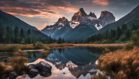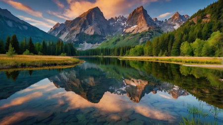 Mountain lake surrounded by snow-capped peaks and lush forests, reflecting warm sunset hues. Ideal for camping, hiking, fishing, and boating. Great for travel promotions.