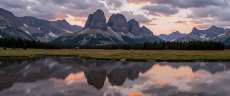 Canmore's famous Three Sisters mountain peaks and their reflections on the Bow River in the southern Banff range of the Canadian Rockies on a cloudy Spring morning.