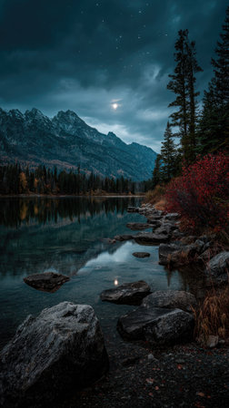 A nighttime landscape features a calm lake reflecting the dark sky and mountains. The scene is dominated by cool colors, with dark green trees lining the shore. The composition suggests a serene and natural environment suitable for environmental or travel-related publications.
