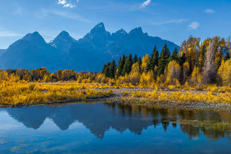 Teton mountain range reflection in the Snake River at Schwabacher's Landing in Grand Teton National Park, Wyoming. Fall scenic nature landscape with evergreen trees and a mountain water reflection.