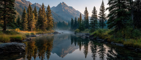 Serene mountain lake at sunrise with mist rising over calm water, pine branches framing dramatic peaks and forest reflection.