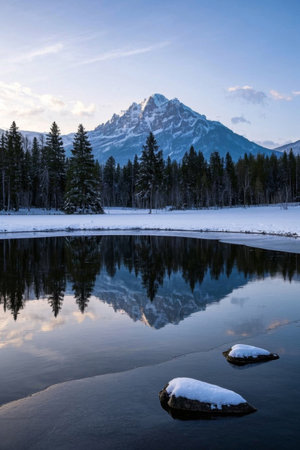 A serene landscape presents snow-covered mountain peaks mirrored in a still lake. Evergreen trees line the shore, contrasting with the bright blue sky. The composition showcases natural textures and light, potentially suitable for travel articles, environmental campaigns, and various commercial projects.
