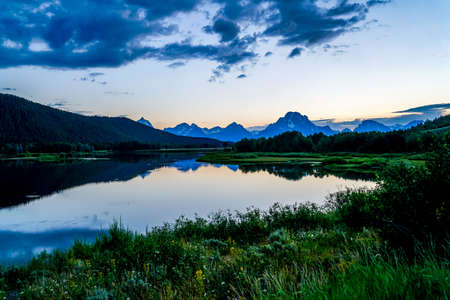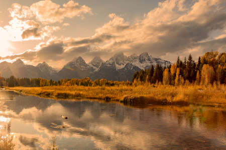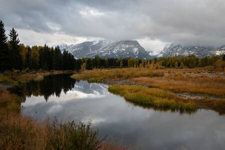 autumn evening shot of the snow covered teton mountains reflected in calm water at schwabachers landing of grand tetons national park
