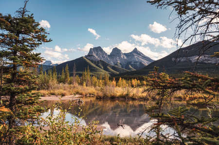 Scenery of Three Sisters mountains in autumn forest reflection on pond at Canmore, Canada