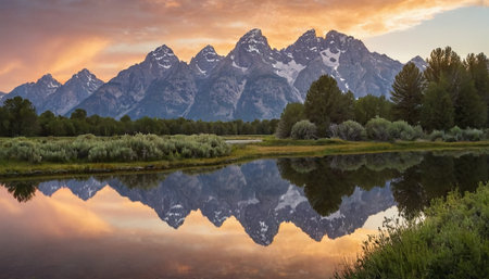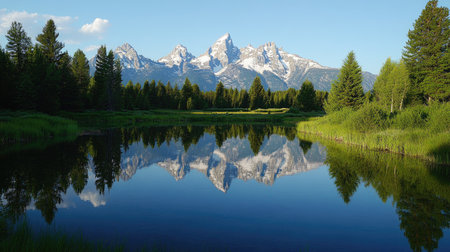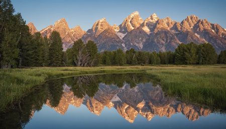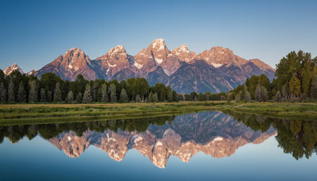 Serene landscape featuring the Grand Tetons and their reflection in a lake. Copy space at the top for text