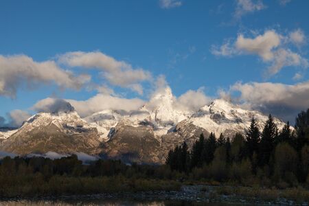 Teton Range covered in clouds in autumn, Grand Teton National Park