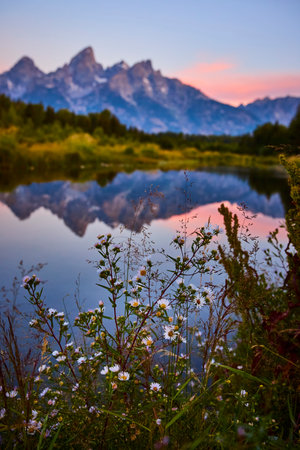 Wildflowers Reflection and Sunrise over Mountain Peaks at Schwabacher Landing