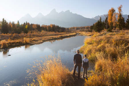 family of two, father and son, hiking and enjoying the gorgeous views in grand teton national parl, wyoming, during fall, active family vacation concept