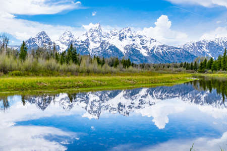 River surrounded by Trees and Mountains in American Landscape. Snake River, Oxbow Bend. Spring Season. Grand Teton National Park. Wyoming, United States. Nature Background.