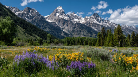 A breathtaking view showcases wildflowers blooming in vibrant colors amidst lush greenery, framed by stunning snow-capped mountains under a clear blue sky.