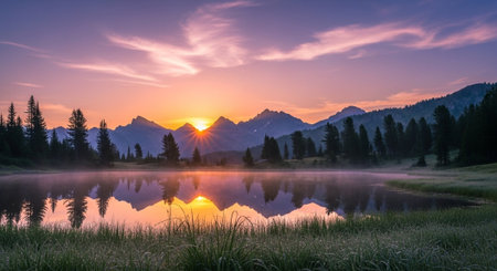 A breathtaking sunset over a still mountain lake, with the reflection of the colorful clouds in the water.