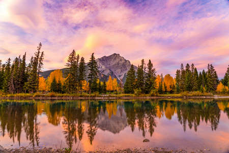 Banff National Park beautiful natural scenery at dawn in autumn foliage season. Fiery pink clouds, Cascade Mountain and colorful yellow and green trees reflected on Bow River. Canadian Rockies.